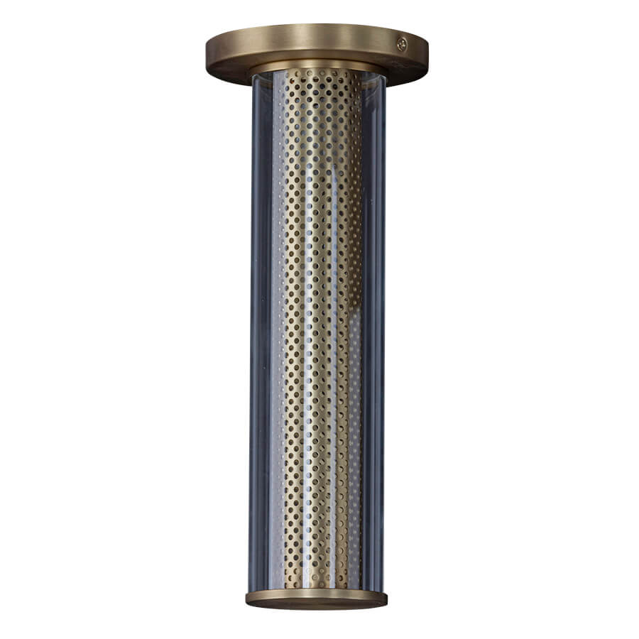 5" diameter x 12-1/8"H Satin Brass Ceiling Fixture, medium base socket, direct wired, Clear Glass with Satin Brass Metal Mesh Inner Shade, recommend 3 watt T10 Clear Filament LED bulb