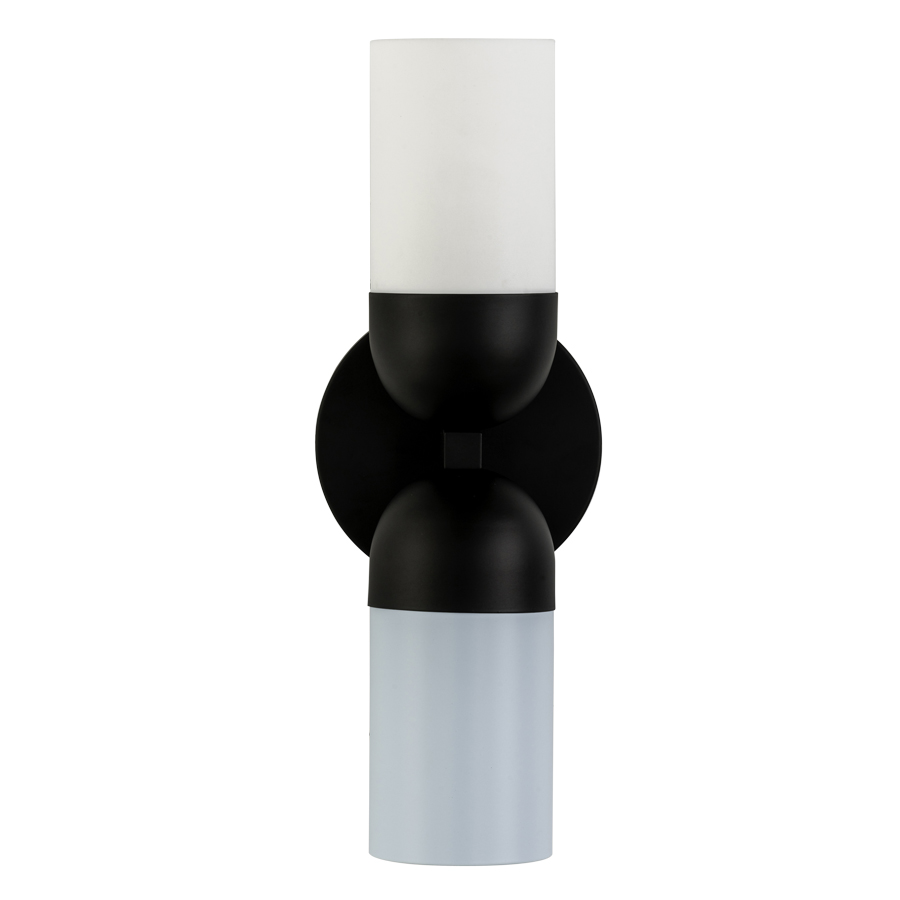 14"H Powder Coat to match RAL9011 Graphite Black Wall Sconce, two medium base sockets, direct wired, with Matte White Frosted Acrylic Top Shade and Blue Hydrangea Matte 2062-60 Metal bottom shade, recommend two 800 lumen LED bulbs