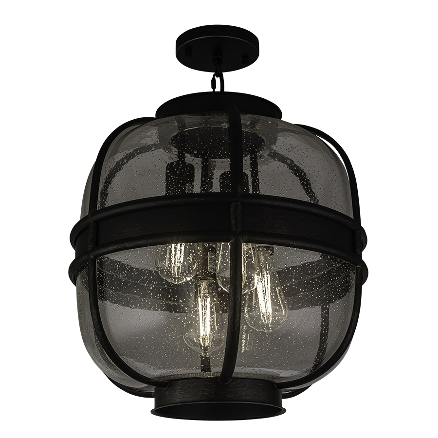 17" diameter Oil Rubbed Bronze Pendant, four medium base sockets, direct wired, 3" Chain, 20.75" overall height, with Clear Seeded Glass, recommend four 5 watt ST19 Clear Filament Glass LED bulbs