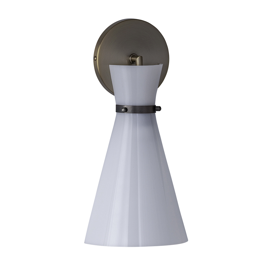 14"H Plated Oiled Bronze to match Wilsonart 6200-00-418 and Plated Champagne to match Formica M2042 Wall Sconce, E12 socket, direct wired, with Opal White Acrylic, recommend 5 watt Candelabra LED bulb