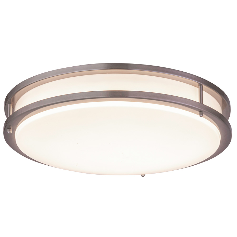 17.75" diameter Brushed Nickel Integrated LED Ceiling Fixture, 34 watt LED, 3400 lumen, 3000K, 90CRI, 120V AC, direct wired, all metal parts have extra clear lacquer coating, with White Frosted Acrylic Diffuser
