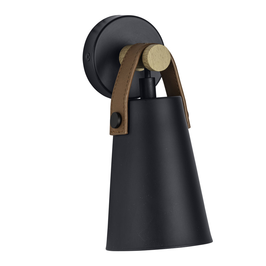 9"H Matte Black Wall Lamp with Natural Wood Dowel and Brown Leather Strap, medium base socket, direct wired, Matte Black Metal Shade, recommend 5 watt LED bulb