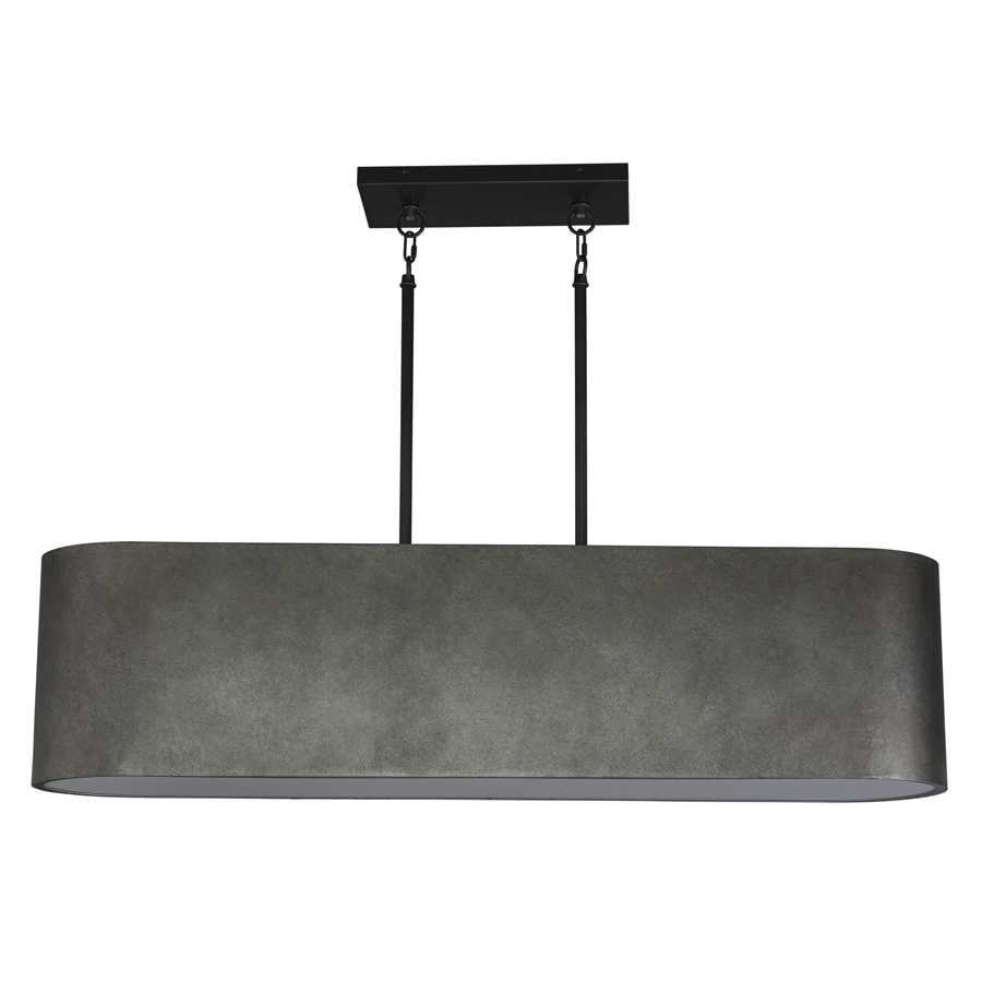 44"W x 64"OAH Powder Coat finish to match Chemetal #614 Beowulf Aluminum Oval Racetrack Pendant, five medium base sockets, direct wired, hung with two Chains, two 15" Down Rods in finish to match Chemetal #354 Alu Dark, and two Brown Fabric cords and with White Frosted Acrylic Top and Bottom Diffusers, Top Acrylic diffuser has vent holes recommend five 1100 lumen LED bulbs