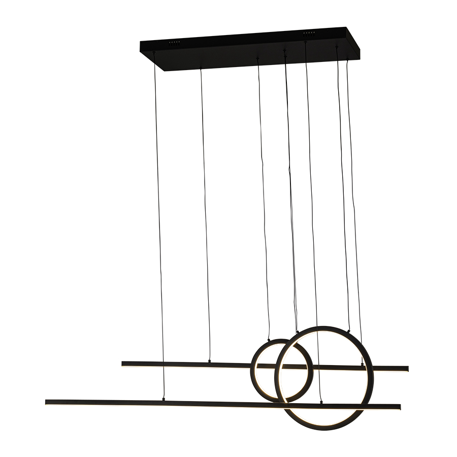 56.25"W Matte Black Integrated LED 4-Light Pendant, one 56.25"W Bar, one 47.25"W Bar, one 15.75" diameter Ring, and one 10" diameter Ring, 60 watt, Input 120V AC, Output DC 12V, direct wired, Black air craft cables hanging at varying heights, White Frosted Acrylic Diffusers