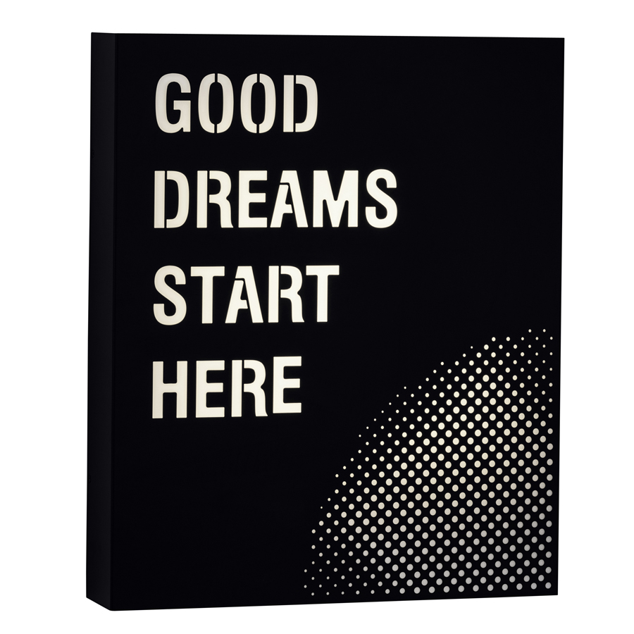 24"H Matte Black Integrated LED Wall Sconce with lazer cut out of "Good dreams start here", four AC 20 watt LED, 8000 lumen, 3000K, direct wired, with Perforated Metal Shade and White Frosted Acrylic inner diffuser