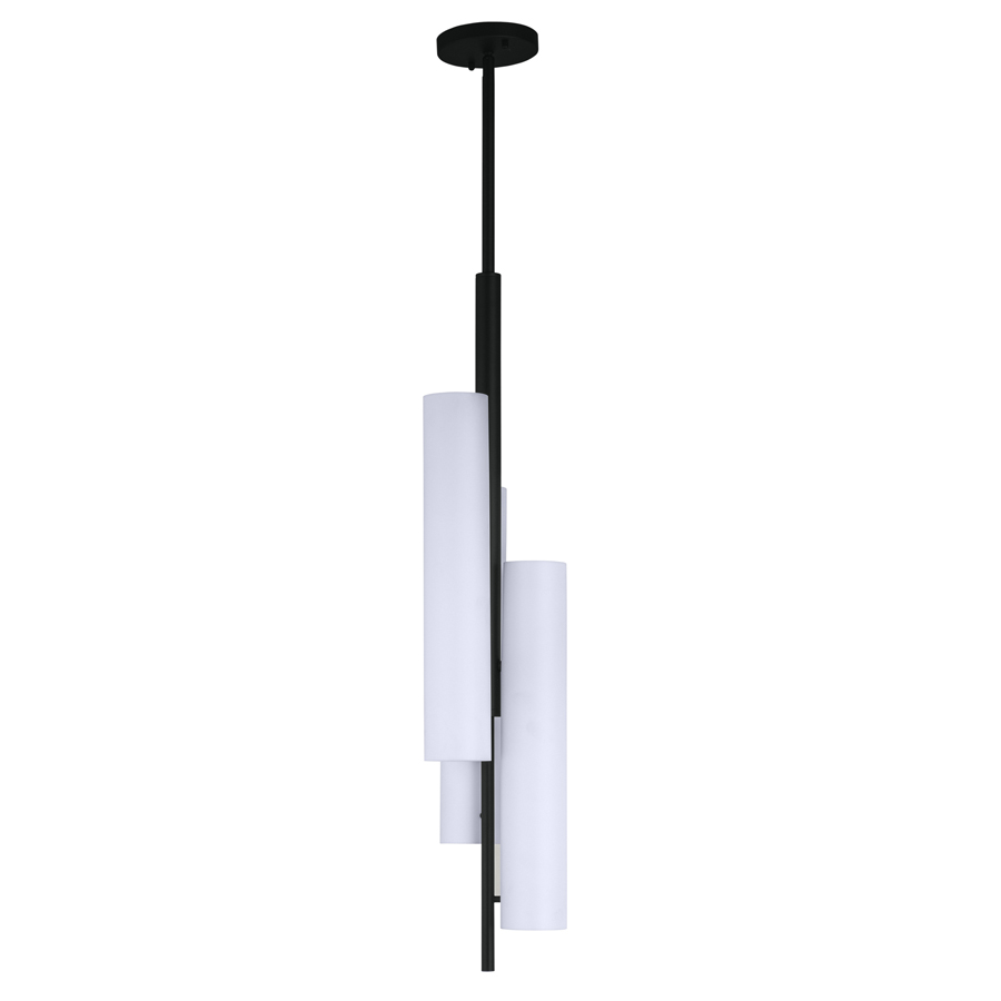 7.5" diameter Powder Coat Matte Black 3-Light Pendant, three medium base sockets, direct wired, three Ivory Acrylic Shades, Matte Black canopy and rod, 45.5" overall height, recommend three 8 watt Clear T9 LED bulbs