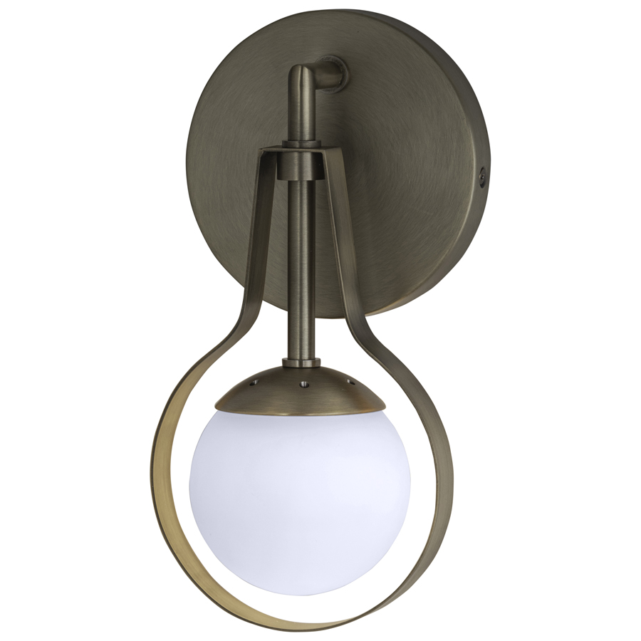 10"H Brushed Brass Integrated LED Wall Sconce, 12 watt LED, 120V AC, 1200 lumen, 3000K, 90CRI, direct wired, with Opal Matte Glass Globe