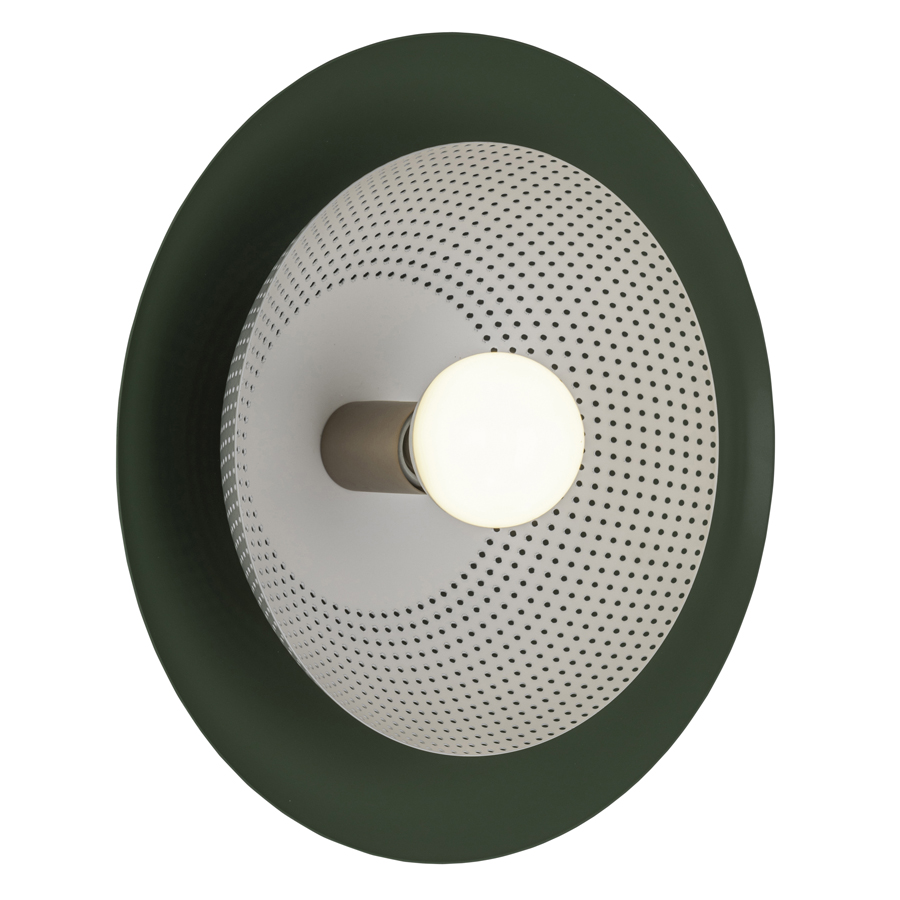 15" diameter Powder Coat to match SW6439 Greenfield and SW7757 High Reflective White satin finishes Wall Sconce with Chemetal Brushed Brass 915 accent piece, medium base socket, direct wired, 11" diameter Interior Shade to be perforated, recommend 6 watt G25 Frosted bulb