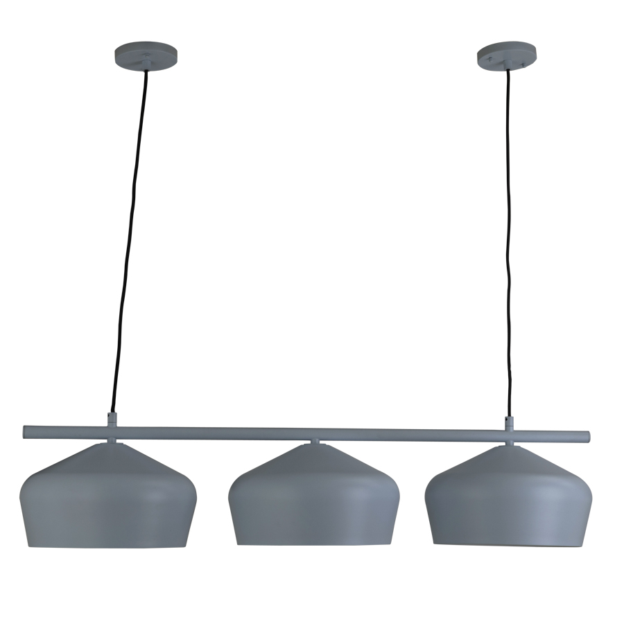 45"W Powder Coat Blue Hydrangea 2062-60 Matte 3-Light Pendant, three medium base sockets, direct wired, adjustable height from 36" up to 72", two adjustable Black cords, three Blue Hydrangea Matte Metal Shades with Pure White RAL 9010 Interior, recommend three 1100 lumen LED bulbs