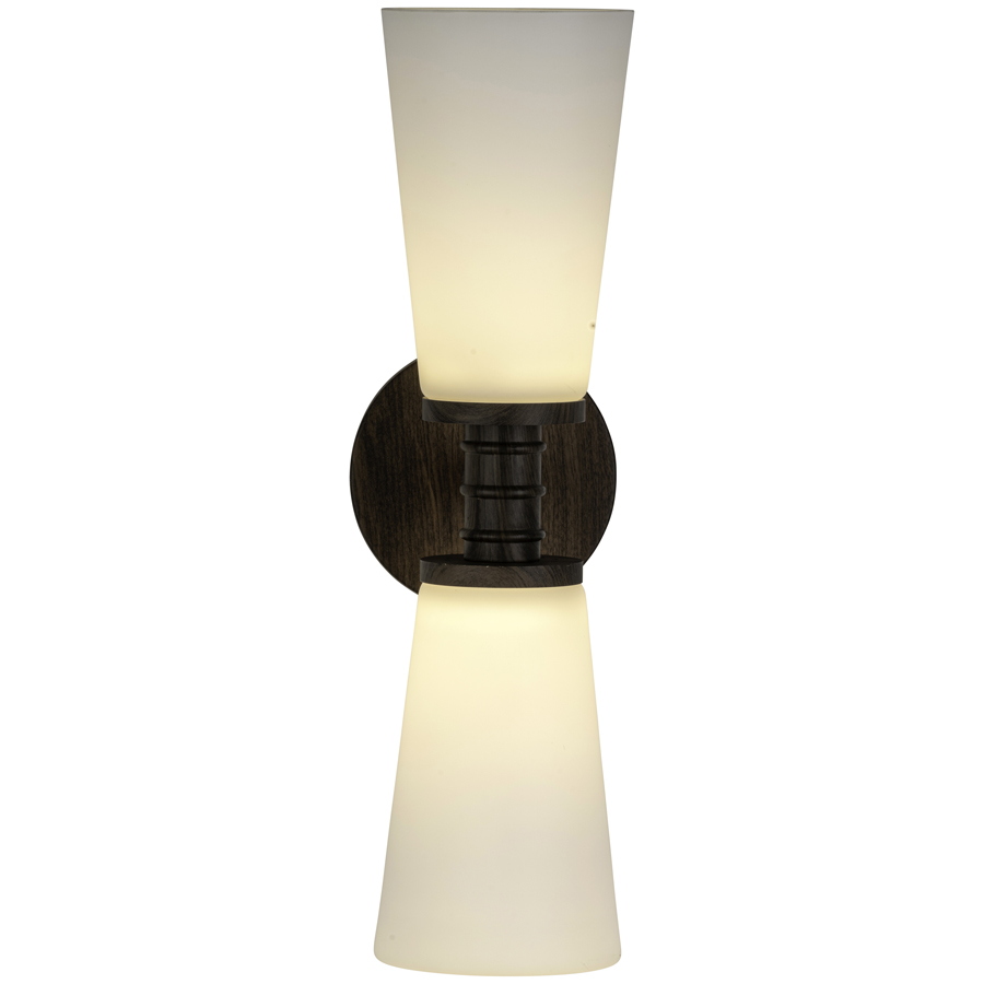 17-3/8"H Matte Light Walnut Numode 9CSN009 Integrated LED Wall Sconce, two 8 watt LED, 1600 lumen, 120V AC, 2700K, direct wired, with two Milk Glass Shades
