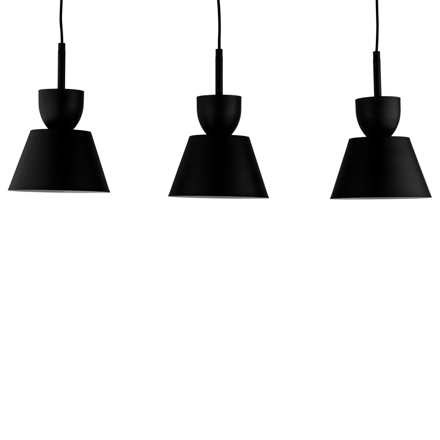 42"W Powder Coat to match Tiger Drylac 09/80130 Smooth Matte Black 3-Light Pendant, three medium base sockets, direct wired, three Smooth Matte Black Metal Shades with Interior to match Tiger Drylac Smooth/Glossy Signal White #138/10003; RAL9003 suspended from adjustable Black cords, recommend three 800 lumen LED bulbs