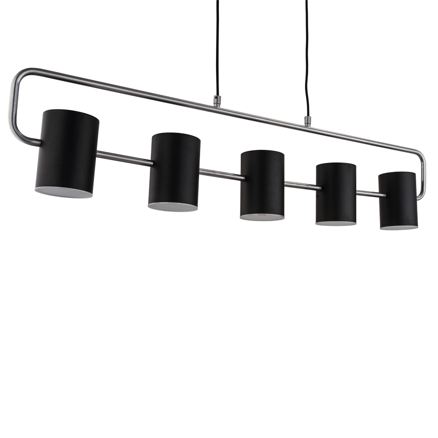 48"W Powder Coat finish to match Tiger Drylac Smooth Matte Black # 09/80130 Pendant with curved metal tube in Tiger Drylac Kromezone #49/95001, five medium base sockets, direct wired, 33" overall height, five metal shades with bottom acrylic diffusers, recommend five 5 watt LED bulbs