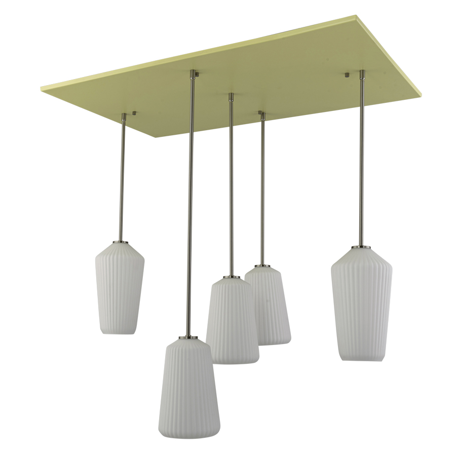 40"x24" Brushed Nickel Pendant with Powder Coat canopy to match SW6908 Fun Yellow, five medium base sockets, direct wired, three 6.5" diameter x 10"H Bell Shaped Ribbed Opal Matte Glass and two 6.5" diameter x 12"H Tulip Shaped Ribbed Opal Matte Glass, recommend five 1100 lumen LED bulbs