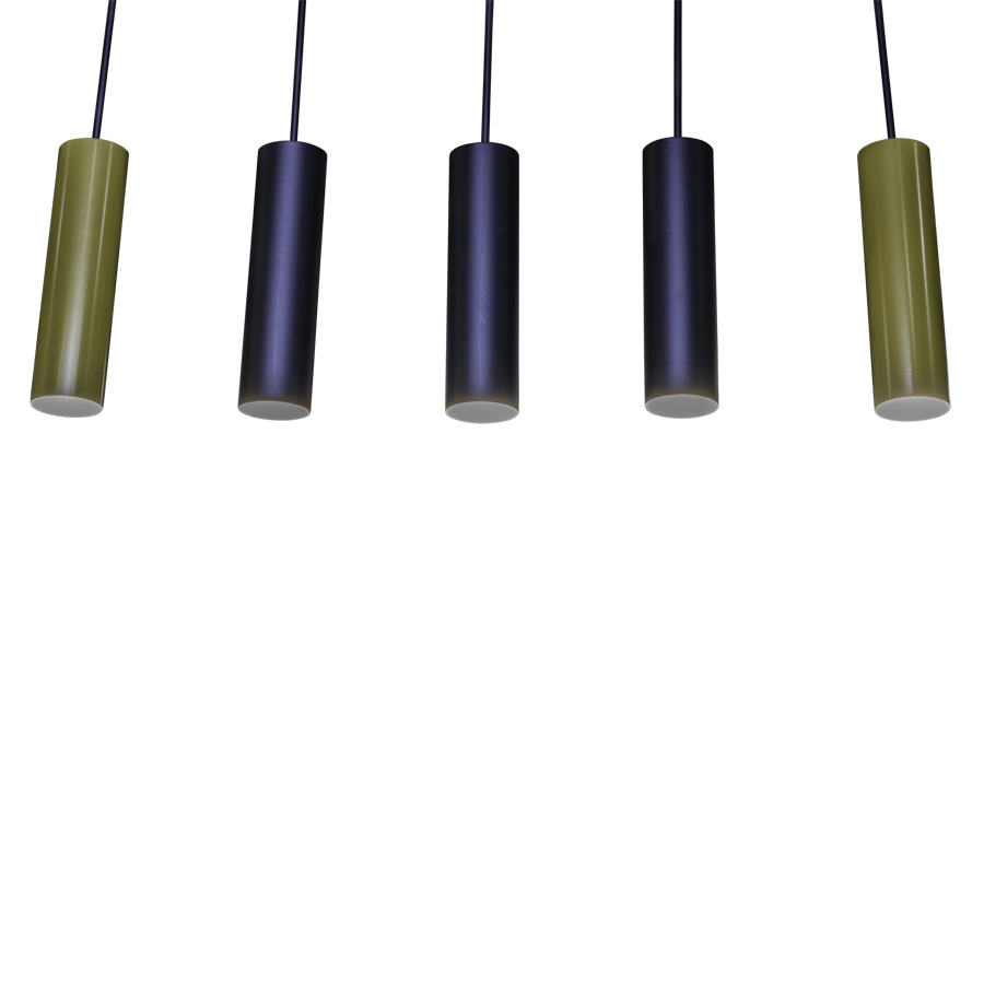 48"W Matte Black and Gold 5-Light Pendant, five medium base sockets, direct wired, 36" overall height, three 4" diameter x 15"H Matte Black Cylinder Shades and two Gold Shades one on each end, recommend five 1100 lumen LED bulbs