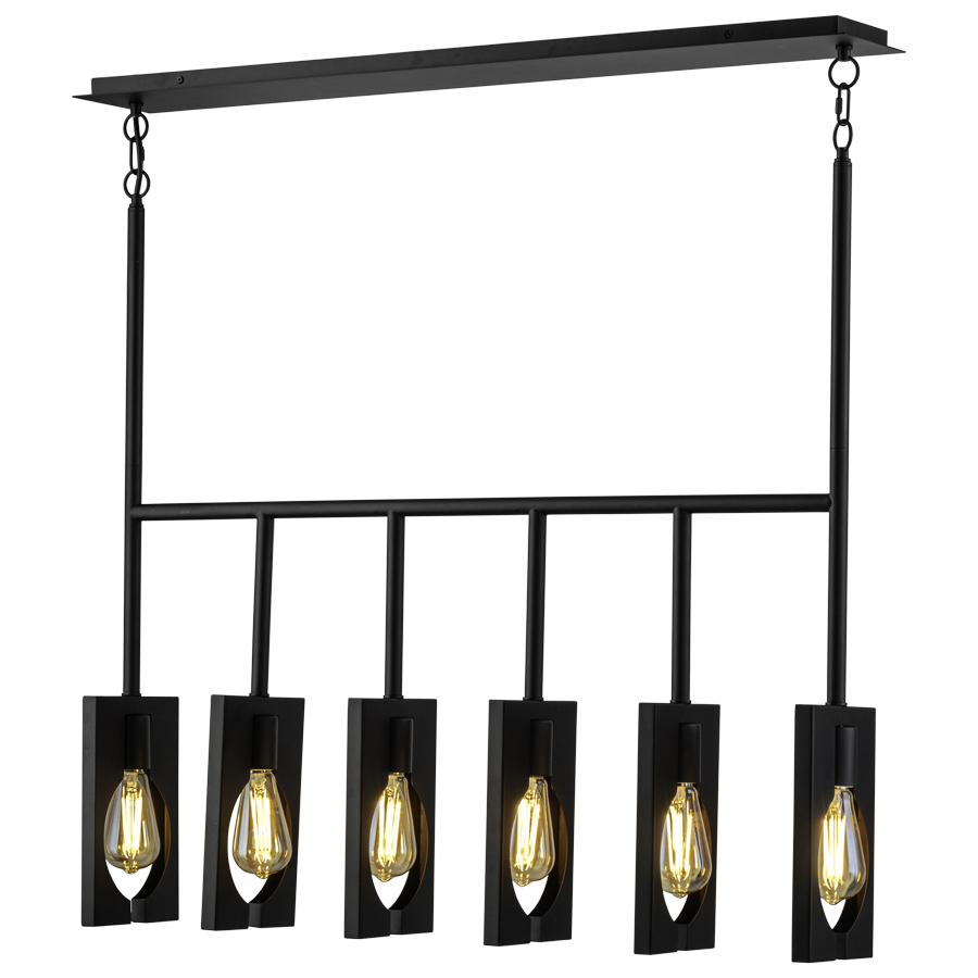 36"W Matte Black 6-Light Pendant, six medium base sockets, direct wired, 36" overall height, recommend six 4 watt Amber Glass ST19 Filament LED bulbs