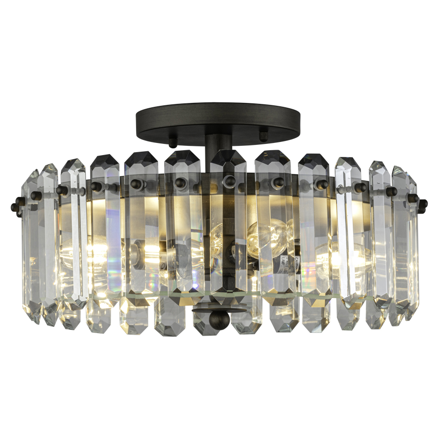 14.25" diameter Hand-Rubbed Antique Brass and Clear Crystal Ceiling Fixture, four E12 sockets, direct wired, with Clear Tempered Glass diffuser, recommend four 5 watt Candelabra LED Bulbs
