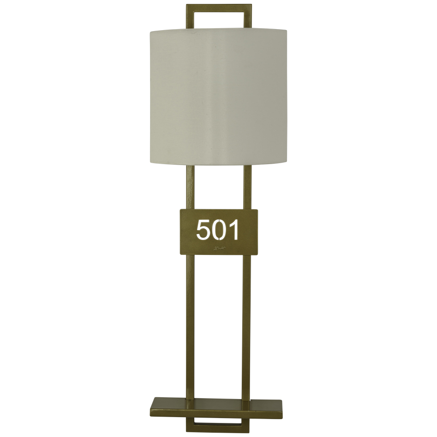 33"H Powder Coat Brass Entry Wall Sconce, medium base socket, direct wired, with 3.875"x 10.5" x 10" Cream Linen Hardback Half Shade, with room signage and braille, with acrylic diffuser behind room number, recommend 1100 lumen LED bulb