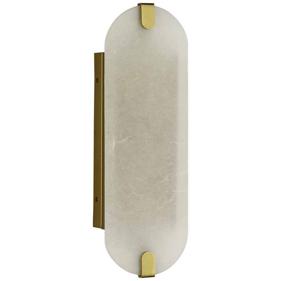 18.125"H Antique Brass and White Alabaster Wall Sconce, two E12 sockets, direct wired, with perforated side panels, recommend two 5.5 watt Clear Candelabra LED bulbs