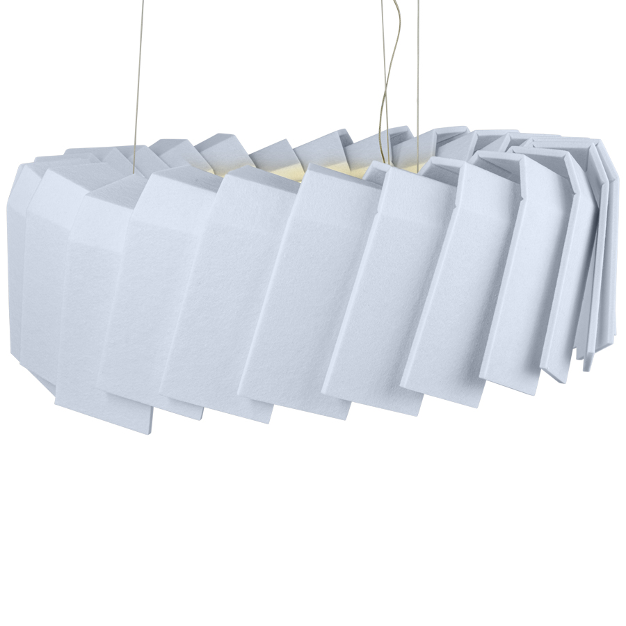 36" diameter White Acoustic Felt Integrated LED Pendant, 34 watt, 3400 lumen, 3000K, 0-10V dimming, 120V-277V, DC12V~24V, direct wired, 74.4" overall height, powder coat Matte White canopy, aircraft cables