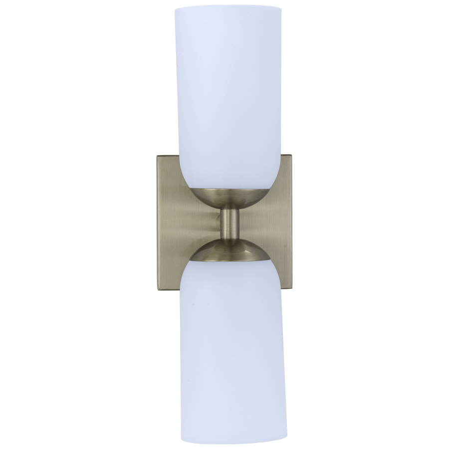 14"H Brushed Nickel Wall Sconce, two medium base sockets, direct wired, with White Frosted Acrylic Shades, recommend two 1100 lumen LED bulbs