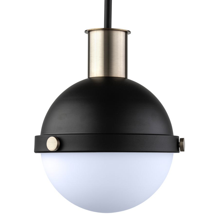8.5" diameter Plated Champagne Bronze and Matte Black Pendant, medium base socket, direct wired, 80" overall height, with Opal Matte Glass Half Globe, recommend 1100 lumen LED bulb