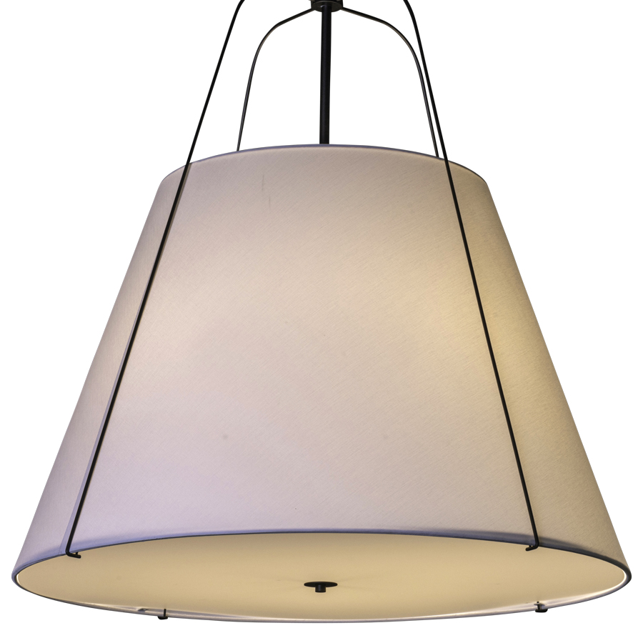 36" diameter Powder Coat Matte Black Pendant with 20"x36"x24" Natural Linen Hardback Shade with Rolled Edges with bottom acrylic diffuser, four medium base sockets, direct wired, 92" overall height, recommend 1100 lumen LED bulb