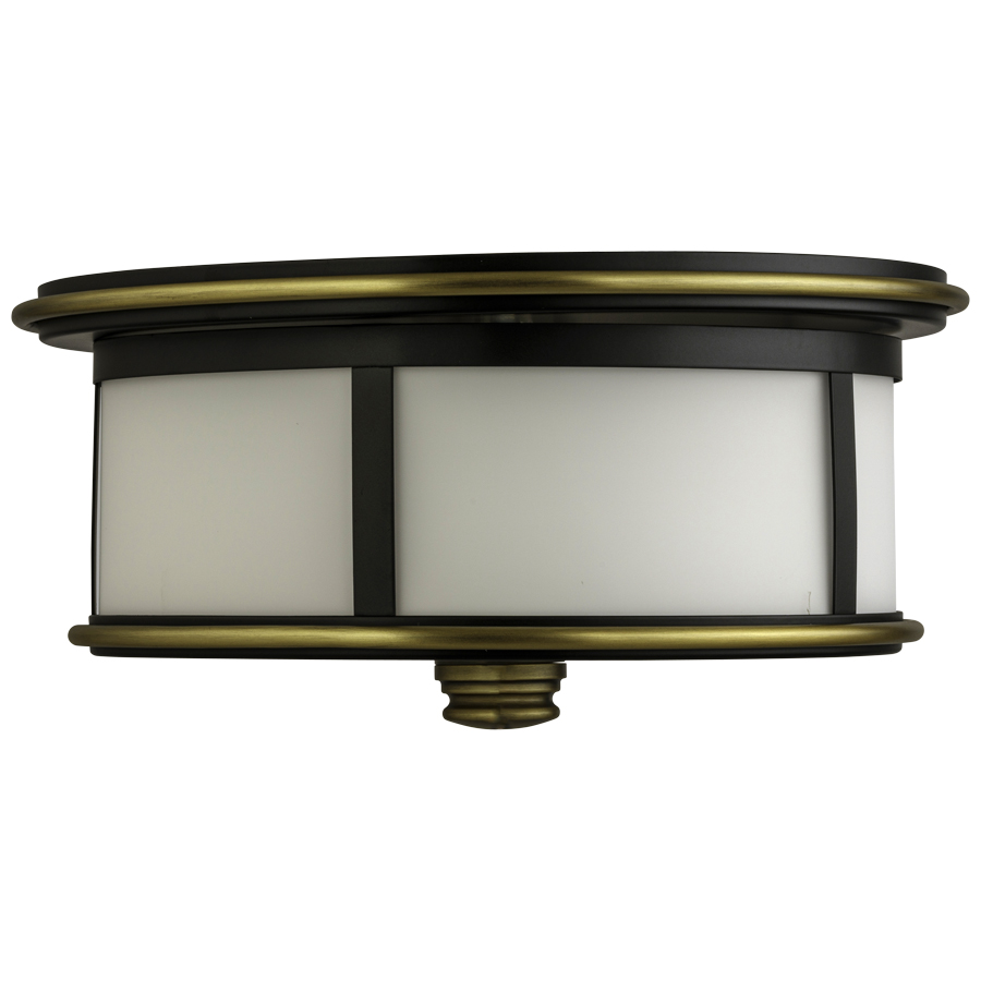 13.5" diameter x 6.5"H Powder Coat Matte Black Ceiling Fixture with Brushed Brass accent bands and finial, two medium base sockets, direct wired, with Opal Matte Glass, recommend two 800 lumen LED bulbs