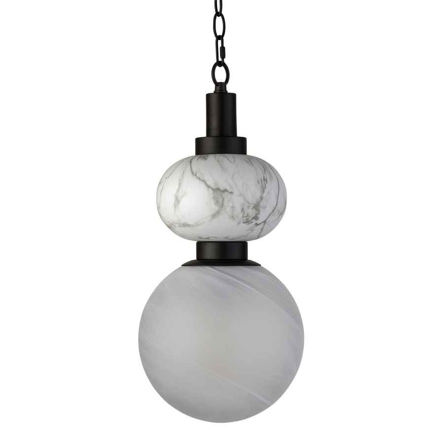 9" diameter Bronze Pendant with Water Transfer White Alabaster accent piece and Matte Swirl Glass Globe, medium base socket, direct wired, 36" Chain, 10' Black Fabric Cloth Cord, recommend 1100 lumen LED bulb