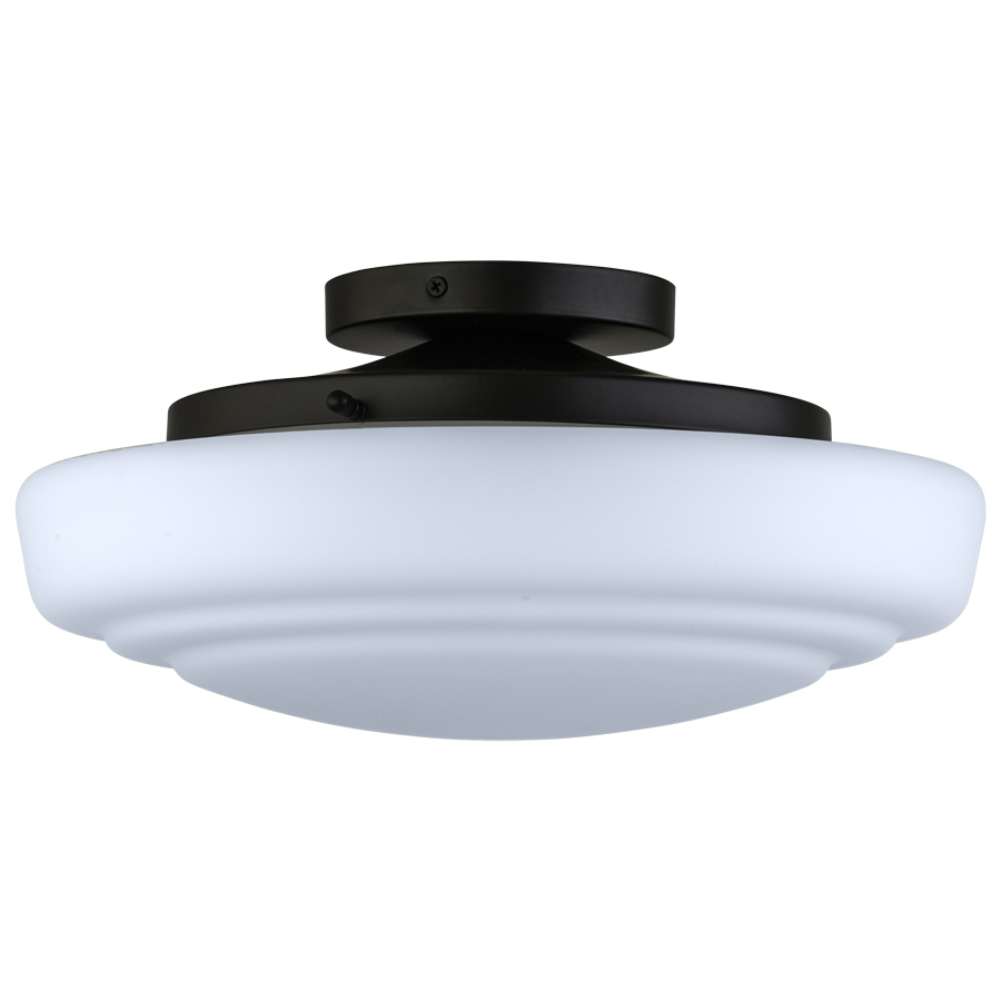 14" diameter x 6.5"H Bronze Ceiling Fixture, two medium base sockets, direct wired, Opal Matte Glass, recommend two 800 lumen LED bulbs