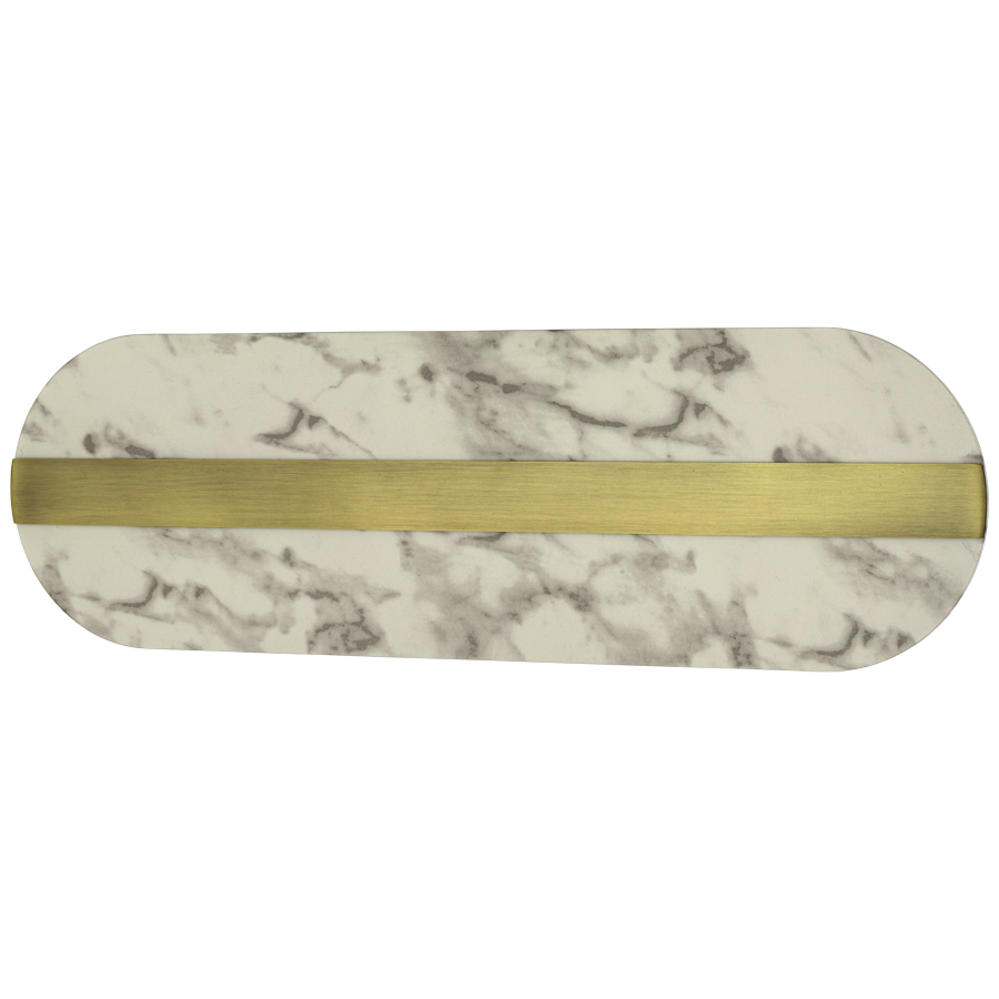 18"W Plated Brushed Brass to match Formica M6423 and Water Transfer Alabaster Acrylic Integrated LED Wall Sconce, 15 watt LED, 1500 lumen, 3000K, 90CRI, Input 120V AC, Output DC12V~24V, dimmable, direct wired, with Powder Coat Matte Black backplate