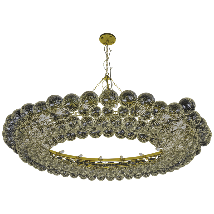 85" diameter x 13.75"H with Gild finish Pendant with Clear Swirled Glass Globes, eighteen E12 sockets, direct wired, adjustable height from 48" up to 60", recommend eighteen 5.5 watt Clear C11 Candelabra LED bulbs
