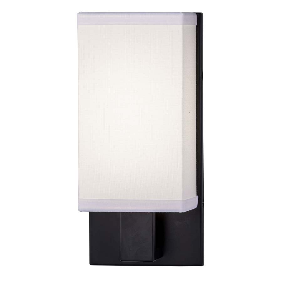 11"H Pottery Bronze Integrated LED Wall Sconce, 6 watt LED, 600 lumen, 3000K, 90CRI, 120V AC, direct wired, White Linen Hardback Shade