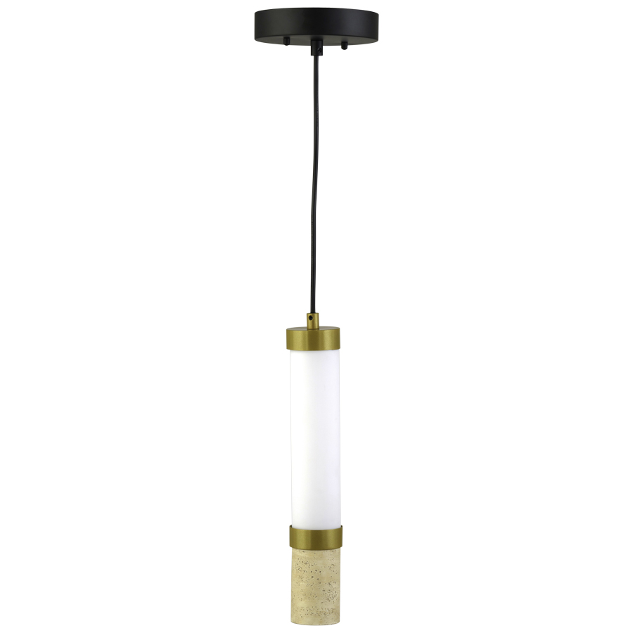 2-3/8" diameter x 15"H Powder Coat Gold and Travertine Stone Integrated LED Pendant, Powder Coat Matte Black canopy, two 5.5 watt LED, 1100 lumen, 3000K, 120V-277V~12V, direct wired, with White Frosted Acrylic diffuser, overall height 84"