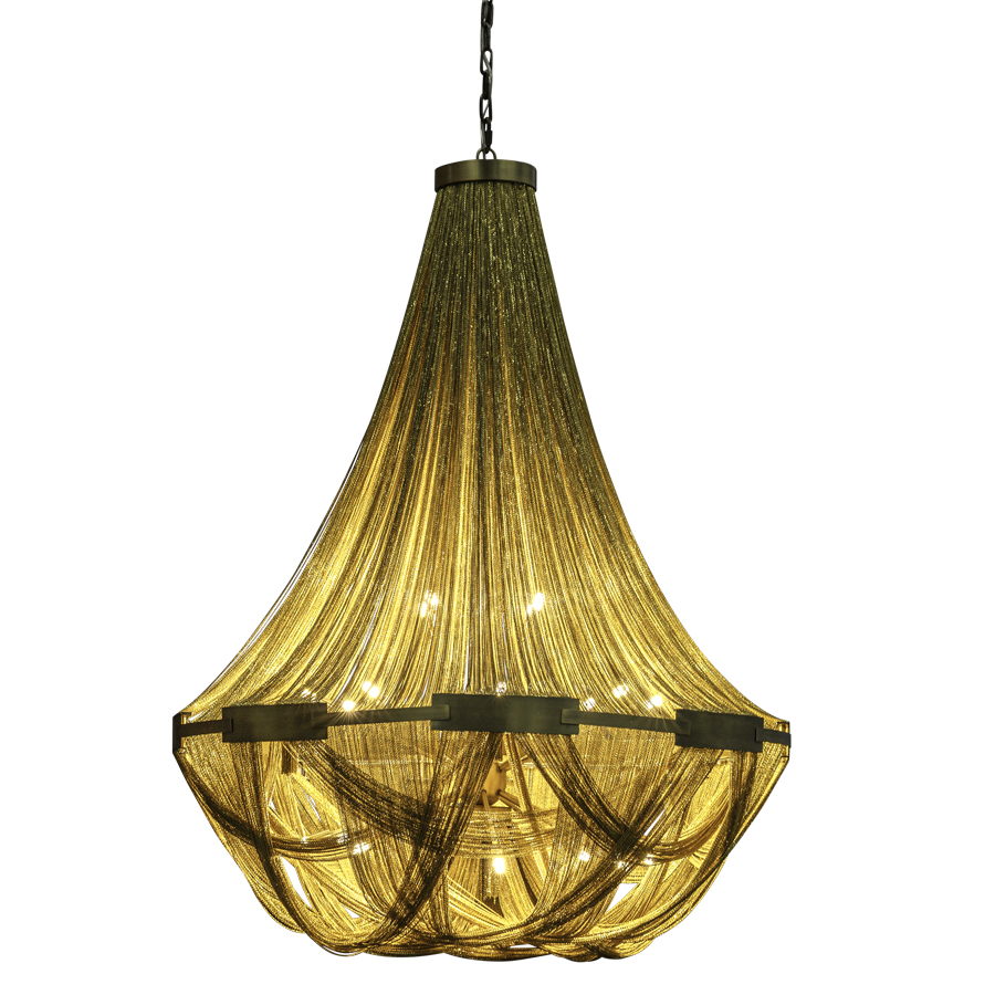 46" diameter x 57"H Plated Natural Brass Pendant with Interlacing Brass Metal Chain, eighteen G9 sockets, 36" Brass Chain,93" overall height, recommend eighteen 5 watt G9 LED bulbs
