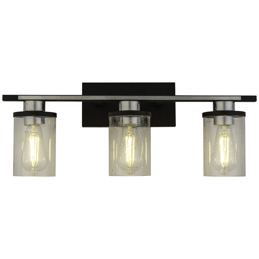 24"W Powder Coat Matte Black and Chrome Vanity Light, three medium base sockets, direct wired, three Seeded Glass Shades, recommend three 8 watt Clear A19 LED bulbs
