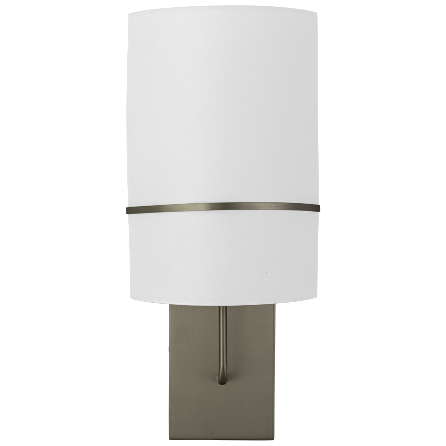 24"H match finish to Octolux Satin Nickel Wall Sconce, medium base socket, direct wired, 4"x10.5"x4"x10.5"x16" Rectangle White Linen Hardback Half Shade with Metal trim, direct wired, recommend 1100 lumen LED bulb