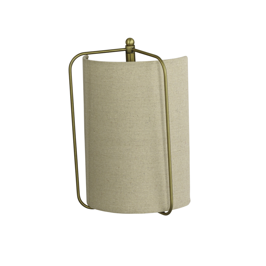 7”W x 12”H Brushed Brass Wall Sconce, medium base socket, direct wired, Natural Linen #1 Half Shade, recommend 800 lumen LED bulb.