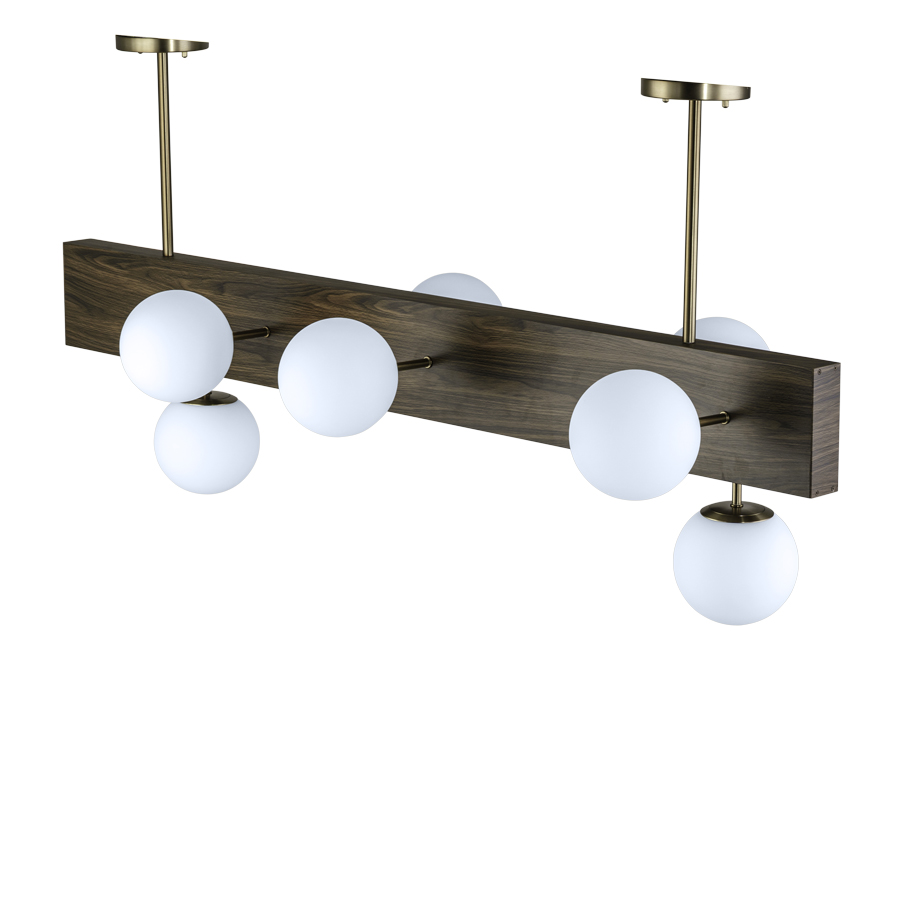 53”W x 20"D x 18”H Pendant with Metal Finish to Match Chemetal 925 Brushed Medium Bronze Aluminum and Wood Stain to match Minwax MW 431, seven medium base sockets, direct wired, 6" diameter White Acrylic Globe Shades, recommend seven 5 watt B11 LED bulbs.