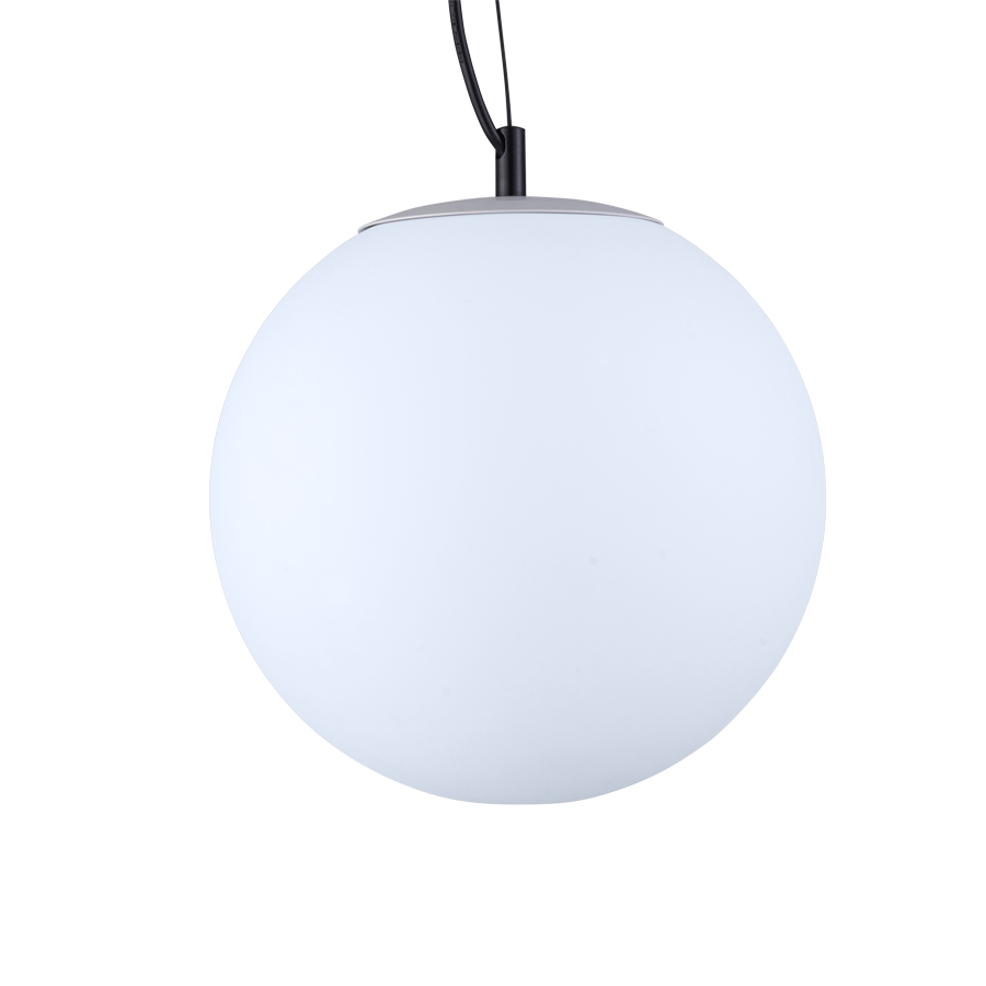11.75" diameter Matte White Frosted Acrylic Pendant with Powder Coat Matte White Top Cap and Matte Black accent piece, medium base socket, 118.1" overall height, direct wired, Powder Coat SW6965 Matte Hyper Blue canopy, recommend 1100 lumen LED bulb