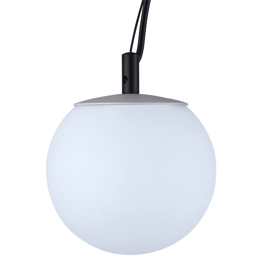 6.25" diameter Matte White Frosted Acrylic Pendant with Powder Coat Matte White Top Cap and Matte Black accent piece, E12 socket, 118.1" overall height, direct wired, Powder Coat SW6965 Matte Hyper Blue canopy, recommend 5 watt Candelabra LED bulb