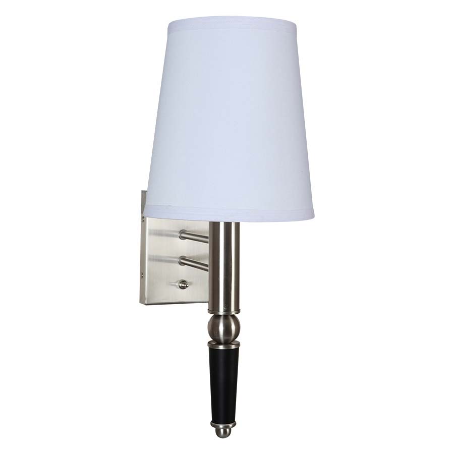19" Brushed Nickel and Black Wood Single Arm Wall Lamp, medium base socket, on/off push button switch at backplate, 8' Silver 45° cord, 6x8x9 Cream Linen Hardback Shade, 24" matching cordcover. Recommend 1100 lumen LED bulb.