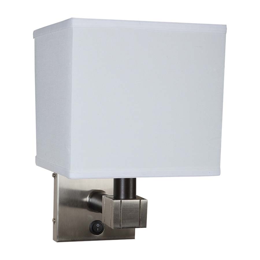 12.5"H Brushed Nickel Single Wall Lamp with Espresso Accents, medium base socket, on/off rocker switch at back plate, direct wired. 8"x8"x8"x8"x7.5" White Linen Hardback Shade. Recommend 800 lumen LED bulb.