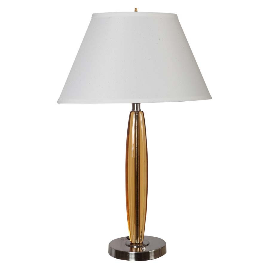 29"H Amber and Brushed Nickel Table Lamp, medium base socket, on/off rocker base switch, 8' Silver 45° 3-prong grounded cord, one outlet, 6"x10"x10"x19"x10" Oval Natural Linen Hardback Shade. Recommend 1100 lumen LED bulb.