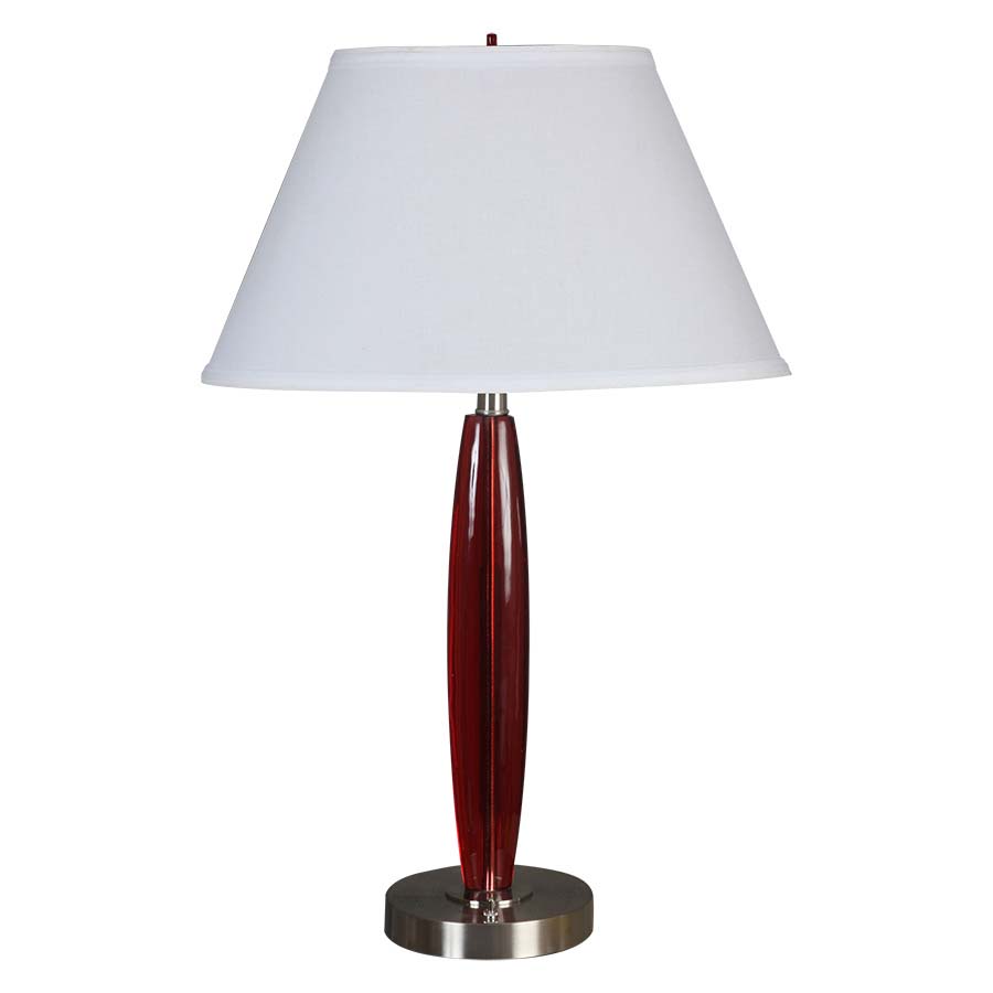 29"H Red and Brushed Nickel Table Lamp, medium base socket, on/off push button base switch, 8' Silver 45° cord, 6"x10"x10"x19"x10" Oval White Linen Hardback Shade. Recommend 1100 lumen LED bulb.