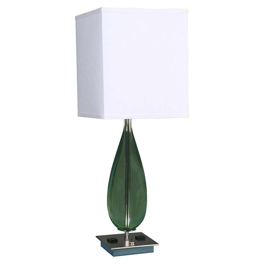 29"H Light Green and Brushed Nickel Table Lamp, medium base socket, on/off rocker base switch, 8' Silver 45° 3-prong grounded cord, two outlets, 10"x10"x10"x10"x12" White Linen Hardback Shade. Recommend 1100 lumen LED bulb.