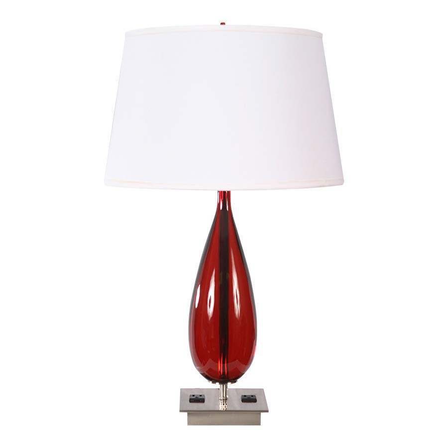 27"H Red and Brushed Nickel Table Lamp, medium base socket, on/off rocker base switch, 8' Silver 45° 3-prong grounded cord, two outlets, 13x16x10 White Linen Hardback Shade. Recommend 1100 lumen LED bulb.