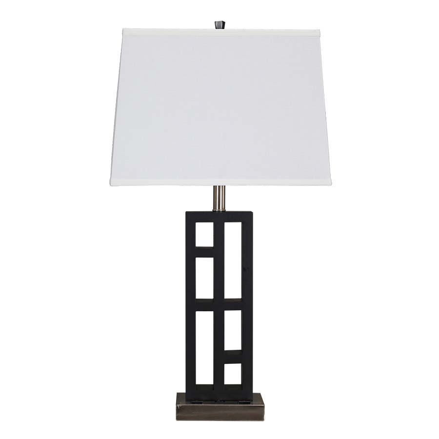 31.5"H Old Espresso and Brushed Nickel Table Lamp, dual GU24 socket, dual on/off rocker base switch, 8' Silver 45° 3-prong grounded cord, two outlets, 8"x15"x9"x17"x12" White Linen Hardback Shade. Recommend two 1100 lumen LED bulbs with GU24 base.