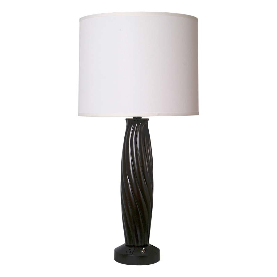 31"H Dark Bronze Table Lamp, medium base socket, on/off push button base switch, 8' Silver 45° 3-prong grounded cord, one convenience outlet, 15x15x12 White Linen Hardback Shade. Recommend 1100 lumen LED bulb.