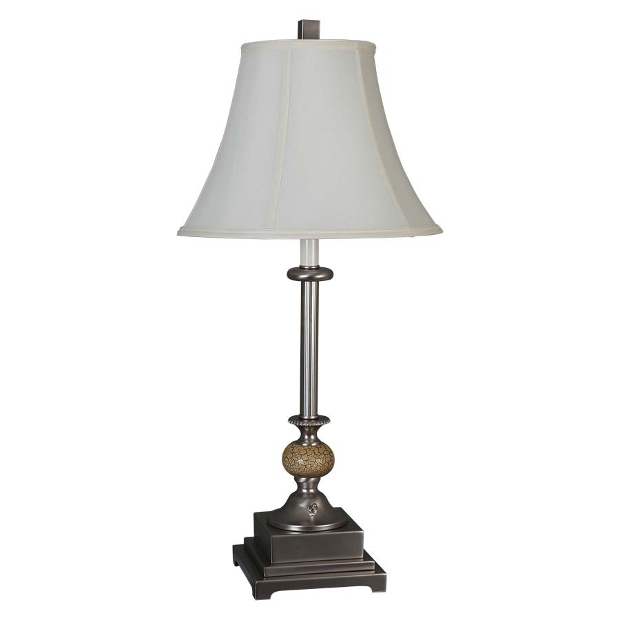 25"H Brushed Nickel Table Lamp with Gold Crackle Ball, medium base socket, on/off push button base switch, 8' Silver 45° cord, 7"x14"x10.5" White Faux Silk Shade. Recommend 1100 lumen LED bulb.