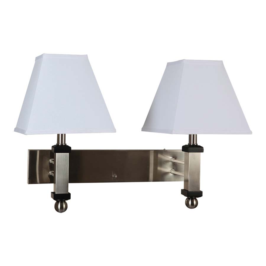 17.75"H Brushed Nickel Double Wall Lamp with Black Accents, two medium base sockets, 3-way,4 position push button switch at back plate, 8' Silver 45° cord, 24" matching cord cover, 5"x5"x10"x10"x9" White Linen HB Shades. Recommend 2-1100 lumen LED bulbs
